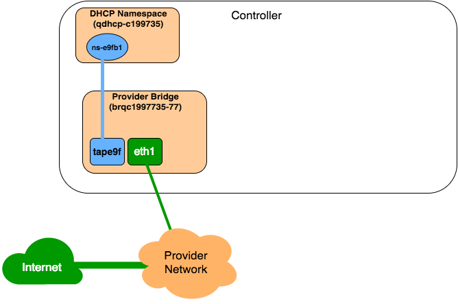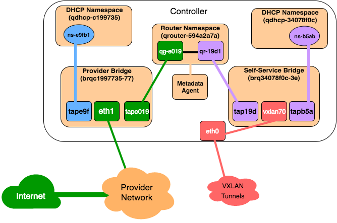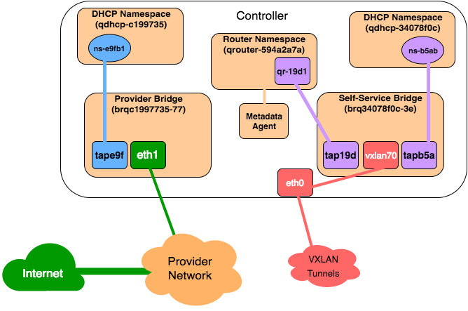 Controller 노드에서 bridge 와 네임스페이스는 아래와 같이 구성되어있다.