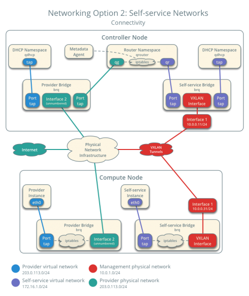 Self-Service Network : 오픈스택을 사용하는 사용자(Tenant)가 직접 자신만의 vm instance 를 위한 네트워크를 구축할 수 있는 네트워크입니다. 이 네트워크는 provider network 를 기반으로 GRE, VXLAN 등의 터널링을 통해 구축됩니다.
