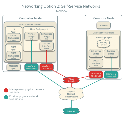 Self-Service Network : 오픈스택을 사용하는 사용자(Tenant)가 직접 자신만의 vm instance 를 위한 네트워크를 구축할 수 있는 네트워크입니다. 이 네트워크는 provider network 를 기반으로 GRE, VXLAN 등의 터널링을 통해 구축됩니다.