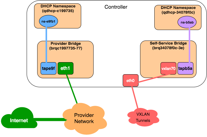 Controller 노드에서 bridge 와 네임스페이스는 아래와 같이 구성되어있다.