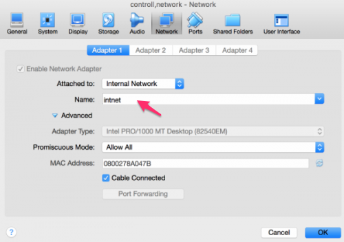 생성 후, VM 네트워크 설정 부분에서 Attach to 를 ‘Internal Network’로 선택하고, Name 에 위에서 설정한 이름인 testinet을 입력하면 됩니다.